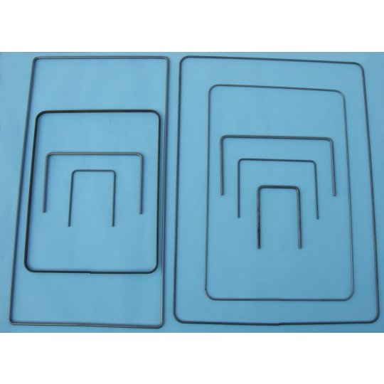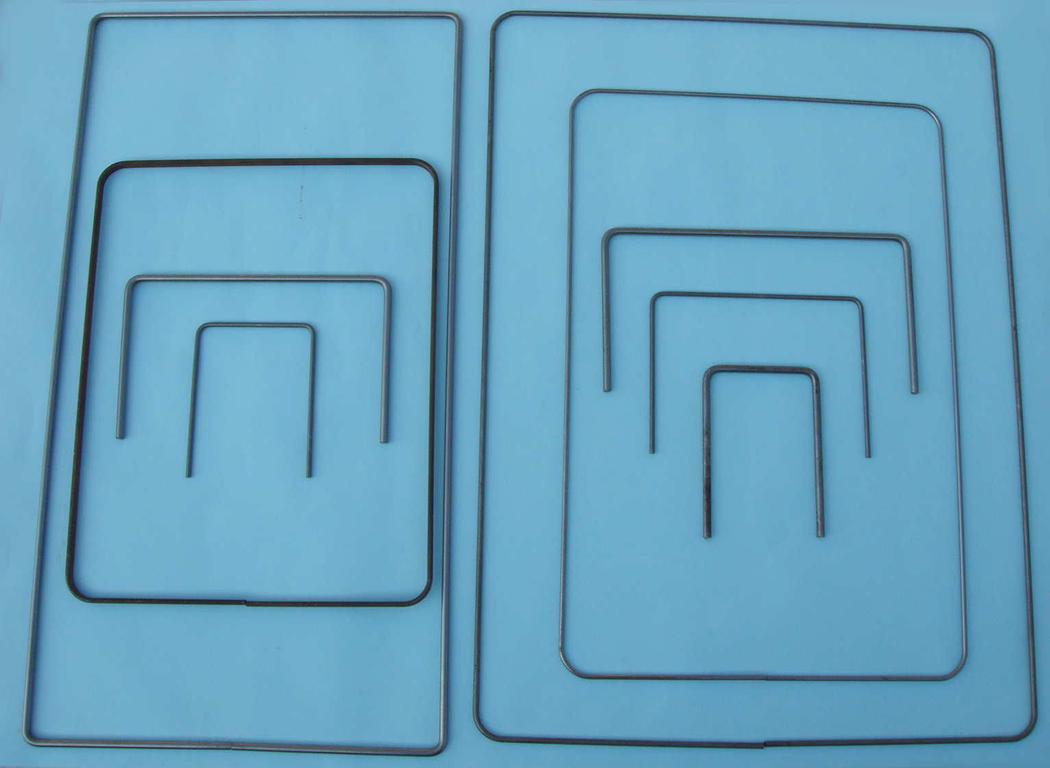 本機適用於鐵板、鐵線之各種四方框、長方形框之彎曲加工。適用成品例如:吊架、網片外框、廚房掛架用具、置物架、掛勾..等。